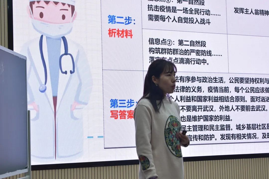 于欣欣老师同样选择的是新冠疫情期间的题材,数学教研组集体改编了一道题,通过数学建模,让疫情的高传染性,与防护知识的有效性有了具体、数学上的认识。数学教研组长陈秋生老师认为于老师是后起之秀,于老师的教学兼顾教知识的传授和课堂气氛的调节,未来可期。