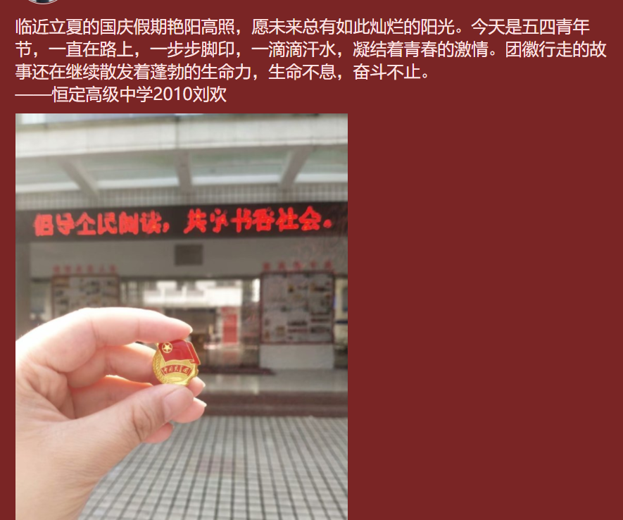 “行走的团徽”主题实践活动是要求全校共青团员在“五一”、“五四”期间外出参加红色研学活动、社会实践活动、志愿服务活动时要佩戴好团徽,亮出身份、增强认同,同时拍摄与徽章的合影,并结合自身经历和体会,写下对行走的理解感悟以及意义诠释。