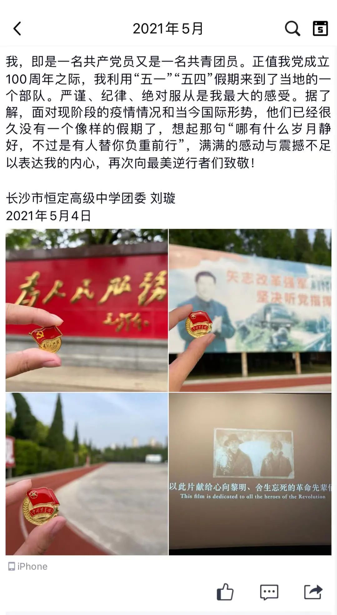 今年是中国共产党成立 100 周年,为落实《共青团中央关于在全团开展“学党史、强信念、跟党走”学习教育的通知》相关要求,为积极响应共青团长沙市教育局委员会关于“行走的团徽”主题教育实践活动的号召,引导广大师生全面认知历史、深化理性认同、不畏风险挑战、勇担强国使命,我校团委利用“五一”、“五四”假期开展“行走的团徽”主题实践活动。